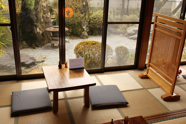店内は座敷で、日本庭園を眺めながら、ゆっくりとお食事を楽しめます。
